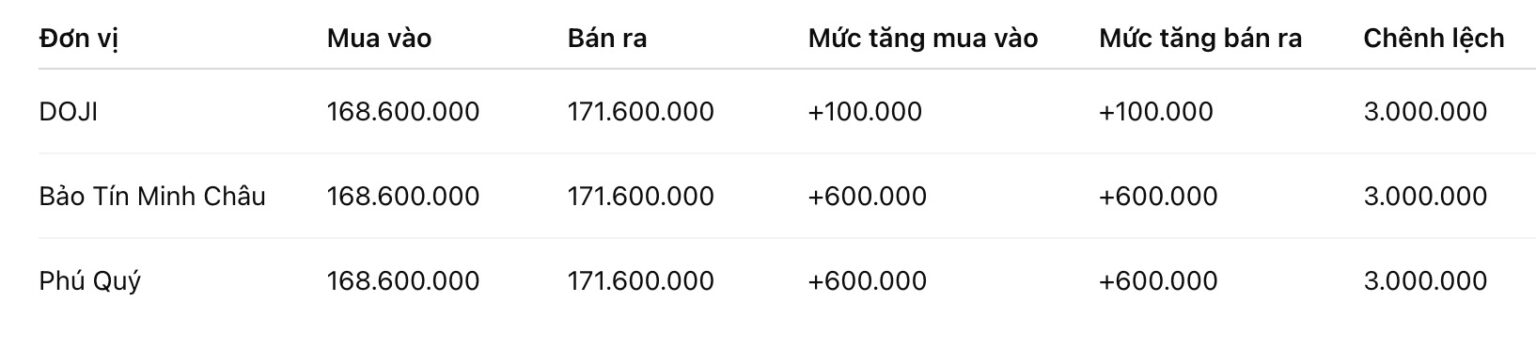 Tính đến 6h00, giá vàng miếng SJC được Tập đoàn DOJI niêm yết ở ngưỡng 168,6-171,6 triệu đồng/lượng (mua vào – bán ra), tăng 100.000 đồng/lượng cả hai chiều mua vào và bán ra. Chênh lệch giá mua vào – bán ra ở ngưỡng 3 triệu đồng/lượng.