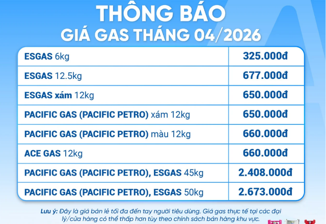 Ngoài ra, Gas South cũng thông báo điều chỉnh giá bán trong tháng 4. Tại TP.HCM và khu vực Đông Nam Bộ, bình gas 12kg được bán ra ở mức 639.000 đồng, tăng 95.000 đồng so với trước. Loại bình 45kg hiện có giá 2.398.100 đồng, tăng 357.000 đồng. Giá bán tại các tỉnh miền Tây thấp hơn đôi chút, trong khi khu vực miền Trung và Tây Nguyên có mức giá cao hơn.
