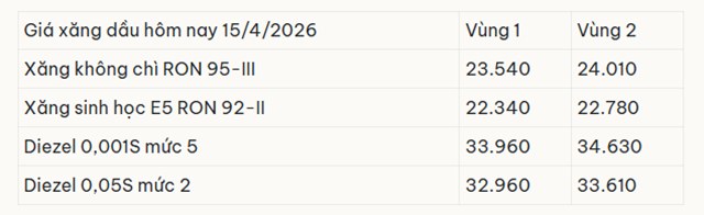 Giá dầu thế giới trong phiên giao dịch ngày 14/4 ghi nhận xu hướng giảm nhẹ. Trong khi đó, thị trường xăng dầu trong nước tiếp tục duy trì mặt bằng giá ổn định sau các đợt điều chỉnh giảm trước đó. Giá xăng dầu hôm nay 15/4/2026 lúc 4h15 sáng. Bảng giá xăng dầu Petrolimex, PVOIL, Mipecorp, Thalexim hôm nay 15/4/2026.
