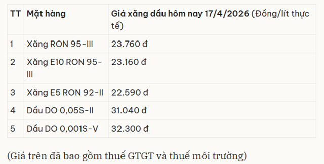 Giá xăng dầu hôm nay (17/4) ghi nhận diễn biến trái chiều. Trong khi giá dầu thế giới đảo chiều tăng nhẹ vào cuối ngày, giá bán lẻ trong nước tiếp tục được điều chỉnh theo hướng xăng tăng nhẹ, dầu giảm mạnh nhờ chính sách thuế mới. Bảng giá xăng dầu Petrolimex, PVOIL, Mipecorp, Thalexim hôm nay 17/4/2026. Xăng RON 95, RON 92, dầu Diesel, dầu hỏa… giá thế nào?