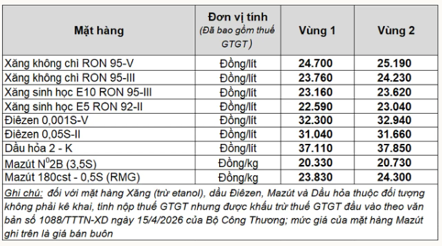 - Dầu mazut: không quá 20.332 đồng/kg