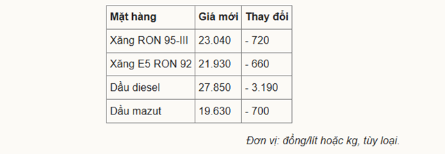 Đối với các mặt hàng dầu, mức giảm sâu hơn đáng kể. Cụ thể, dầu diesel hạ 3.190 đồng/lít, xuống còn 27.850 đồng/lít; dầu mazut cũng giảm 700 đồng/lít, còn 19.630 đồng/kg.