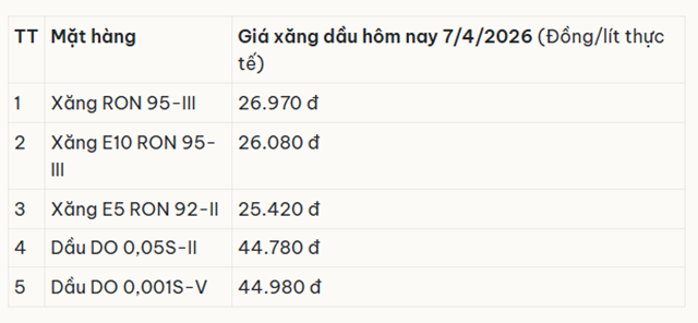 Giá xăng dầu hôm nay 7/4/2026. Bảng giá xăng dầu hôm nay 7/4/2026 từ Petrolimex, PVOIL, Mipecorp, Thalexim…