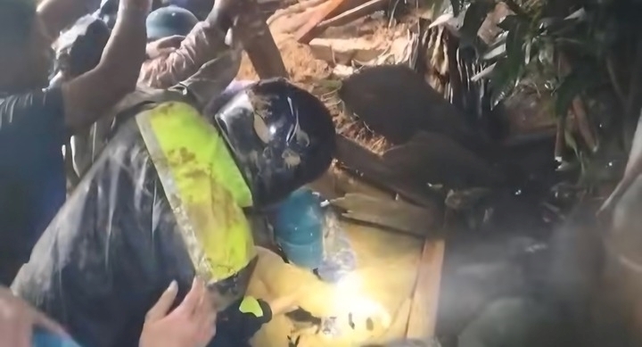Lực lượng chức năng bới trong lớp bùn đất để đưa nạn nhân ra ngoài. Ảnh: VTC News