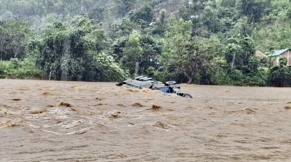 Trong lúc lực lượng chức năng tổ chức cứu nạn, dòng nước lũ tiếp tục chảy xiết khiến xe container bị lật và cuốn trôi. Hiện tài xế mất tích, công tác tìm kiếm vẫn đang được triển khai khẩn trương.